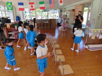 ドッジビーをしました。子どもたちは、積極的にフリスビーを取りに行ったり、真剣にフリスビーをよけたりしていました。