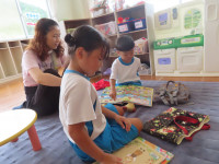 年少さんは、登園してすぐにシールを貼りました。今日はタイのシールだったので喜んでいます。